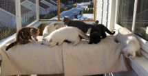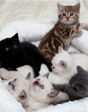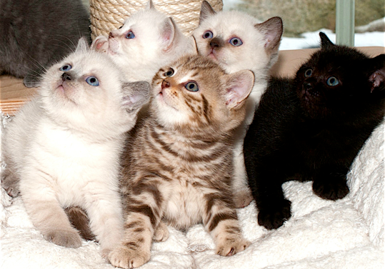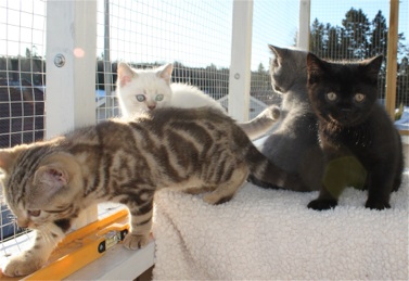 Vi er utrolig stolte av å presentere vårt første kull, som ble født 10. desember 2011. Mamma er vår vidunderlige Gaia og pappa er fantastiske Rydiger som bor i Bergen. Da de ble født holdt Vita på å øve inn «Blackbird» av The Beatles på gitar, og vår lille sorte gutt stod fram som en selvklar «Blackbird», også viste de sin karakter i tur og orden, og fikk sangnavn som passer deres lynne. Hver og en er helt unik, og det er en stor opplevelse å få kose, stelle og leke med disse små vidunderene. De virker så glade der de beymringsløst hopper og spretter etter hverandre, klatrer som bjørner i klatretreet, slafser og gomler mat høylydt, nyter å bli slikket og være inntil mamman sin og elsker oppmerksomhet og kos fra oss. På bildene på denne siden er de 5 uker gamle. Klikk på bildene så kommer du til deres individuelle sider.